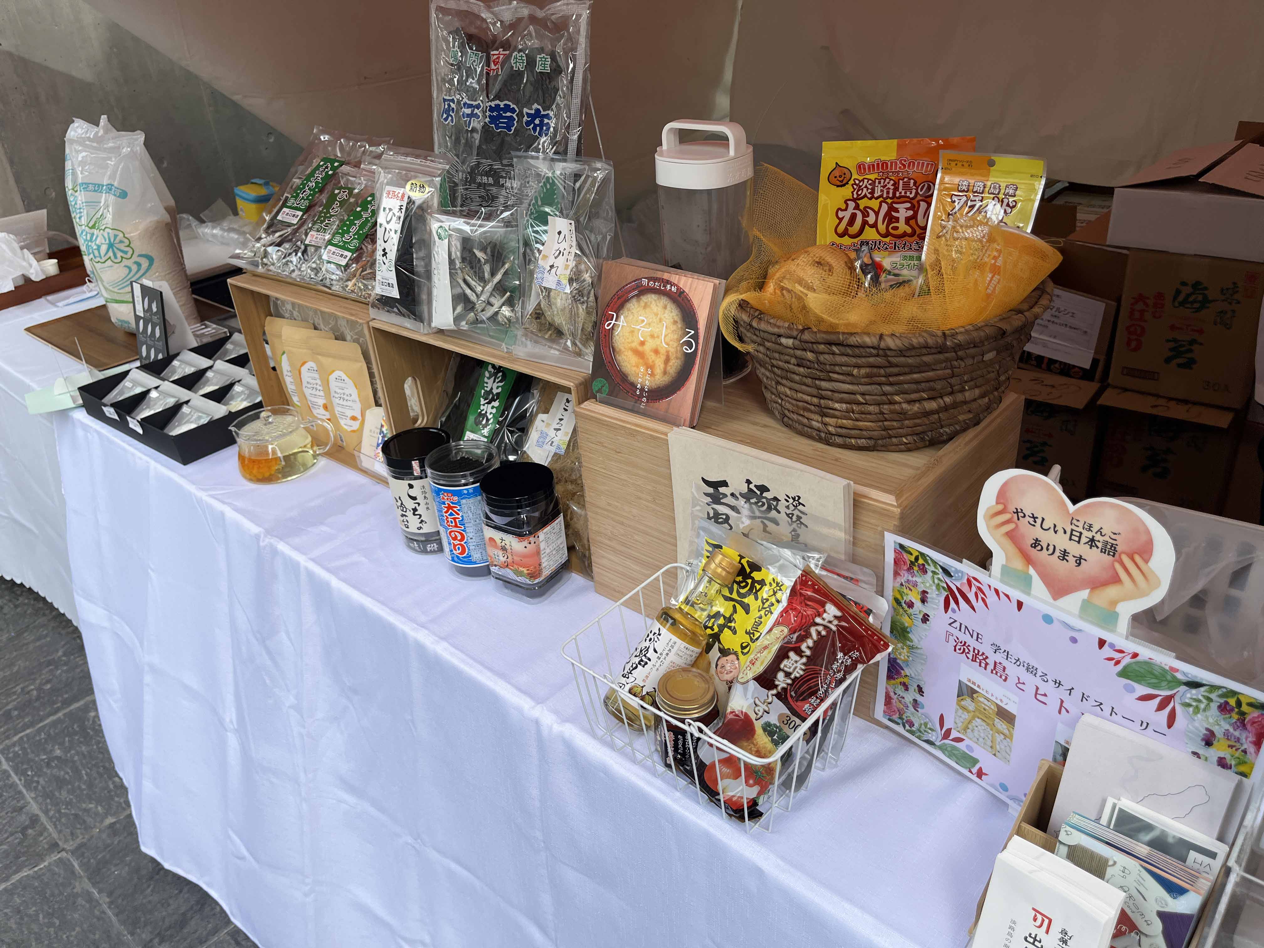 本ブースでは、淡路島産の玉ねぎ関連商品やカレンデュラのハーブティー、海産物、米、お香など、学生たちが現地で発掘した多様な地域産品を販売しました。